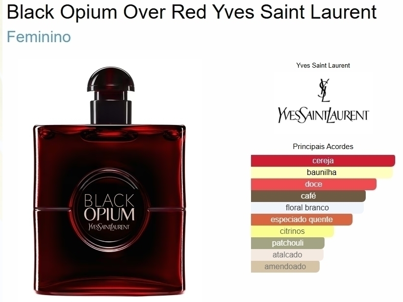 Black Opium Over Red é uma releitura ousada e sedutora do icônico Black Opium. Combinando a intensidade do café com a doçura vibrante da cereja vermelha e o calor da baunilha, esta versão revela um lado ainda mais provocante e viciante da linha. Uma fragrância gourmand, intensa e envolvente, ideal para quem ama perfumes doces com personalidade marcante.