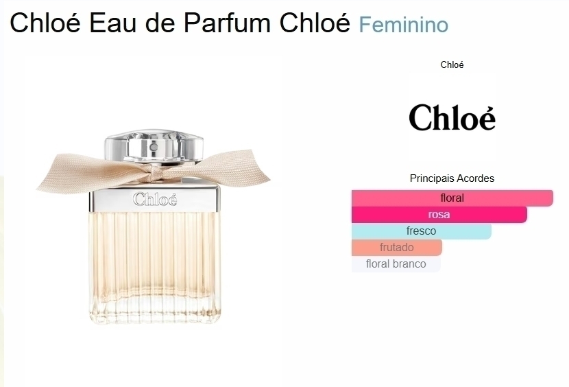 Chloé Eau de Parfum é uma fragrância feminina, elegante e delicada que combina notas frescas de peônia e lírio do vale com um coração floral de rosa e magnólia, finalizado com um toque suave de cedro e almíscar. Um perfume que expressa naturalidade, charme e sofisticação.