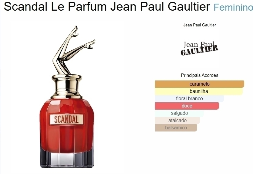 Scandal Le Parfum é uma fragrância intensa, envolvente e sedutora, com uma combinação irresistível de notas florais e doces. O destaque fica para o jasmim, o caramelo salgado e a baunilha, que juntos criam um rastro marcante e sofisticado.